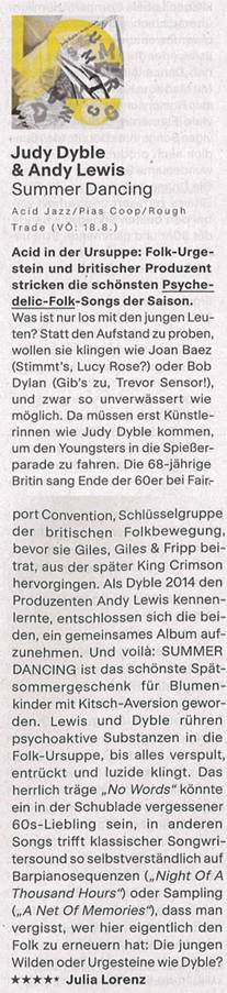 What is wrong with the youth of today? Instead of rebelling, they want to sound like Joan Baez (Right Lucy Rose?) or Bob Dylan (admit it, Trevor Sensor) as undiluted as possible. It takes artists like Judy Dyble to come along and crash their bourgeois parade. Back in the late 60s, the 68 year old Brit sang with Fairport Convention, keystone of the British folk movement, before she moved on to Giles, Giles and Fripp who later formed King Crimson. When Dyble met producer Andy Lewis in 2014, they decided to record and album together. Voilá: Summer Dancing is a nice late summer gift for flower children who are allergic to kitsch. Lewis and Dyble mix psychoactive substances in the primordial soup of folk until it all sounds trippy, enrapturing and lucid. The wonderfully languid “No Words” sounds like it a forgotten 60s favorite. In other places, classic songwriting flows so naturally into bar piano sequences (“Night Of A Thousand Hours”) or sampling (“A Net Of Memories”) that one forgets who is supposed to be modernizing folk: the young rebels or icons like Judy Dyble?